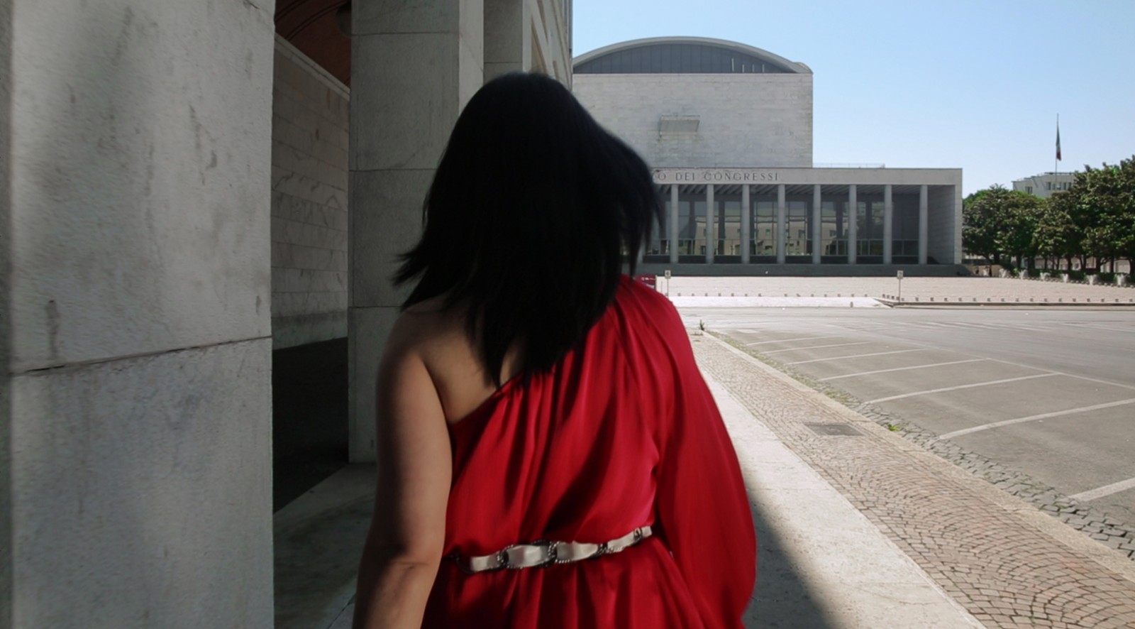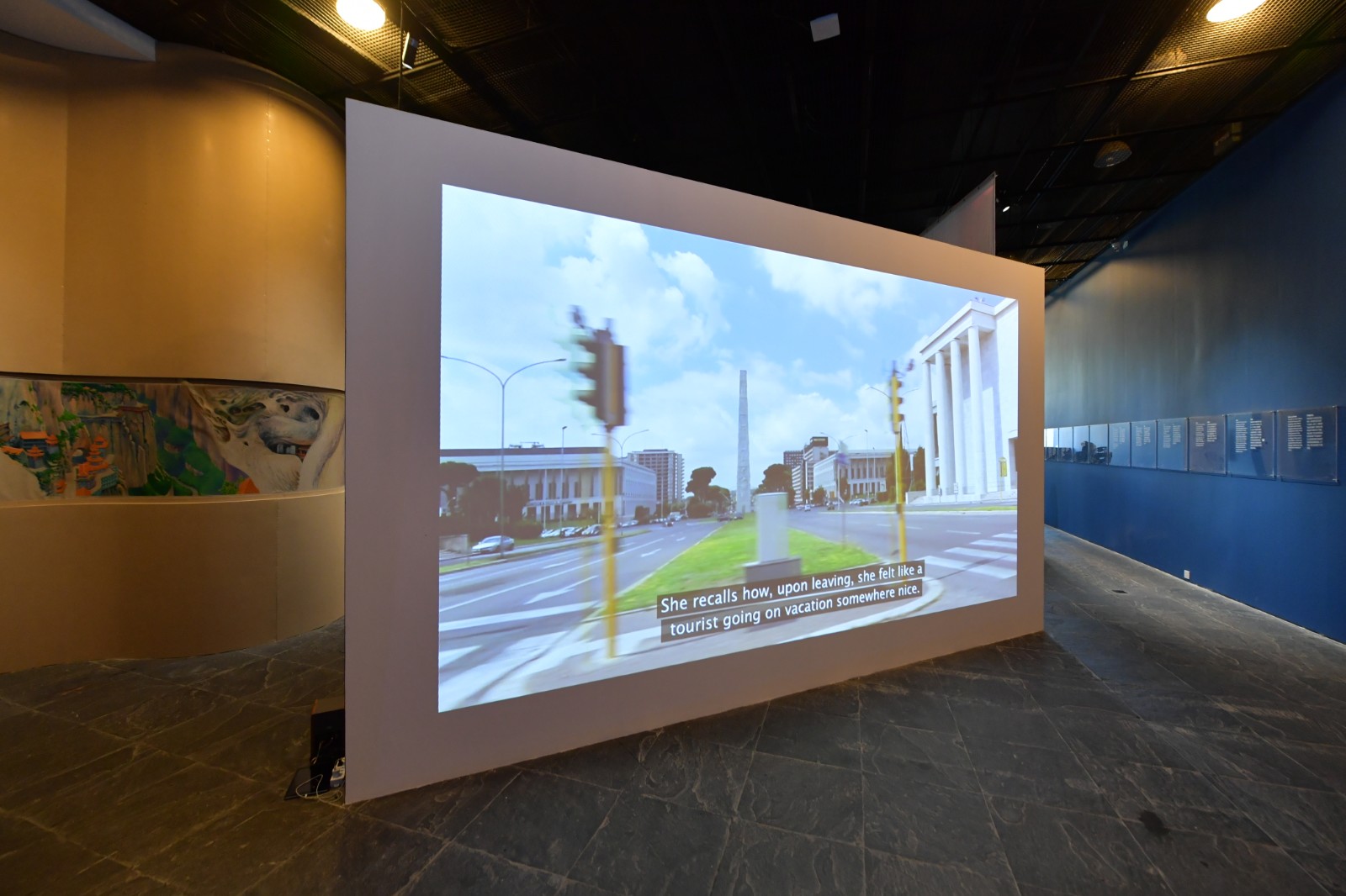 梅·海瑟格(Maj Hasager)《我們將在盲點相遇》是展覽呈現(xiàn)的最后一件作品,其講述了關(guān)于羅馬新城EUR區(qū)(Esposizione Universale di Roma)里的菲律賓移民的故事。這座由墨索里尼親自監(jiān)督設(shè)計的,以法西斯美學(xué)構(gòu)想出來的烏托邦城市,直至1960年才建成并被逐步被開發(fā)為羅馬新的富人區(qū)。海瑟格把眾多意大利導(dǎo)演在EUR區(qū)攝制的紀(jì)錄片、電影所刻畫的城市公共記憶,與這群定期在市中心一座教堂的地下室聚會的移民社群一同放入她的影像作品中,影像記錄了這個群體的閑暇時光,以一種個人的、私密的視角探索了菲律賓移民的私人記憶與生活如何融入并生存于這座有著強大歷史記憶的城市之中。正如約翰·伯格(John Berger)在《第七人》中的論述:“兩群不同的人在任何情況下,永遠(yuǎn)都是共性大于差異性的。只是由于種種原因,環(huán)境蒙蔽了人們的眼睛?!盵7]我們看得見的是歷史的記憶碾壓而過留下的軋痕以及其帶來的城市變遷,而看不見的是居于其中的人是如何在此種變遷中安放自我的記憶與故事。從這個立意來看,展覽所討論的議題似乎又回溯到了“公共”與“私人”,“歷史”與“記憶”之間的連接,然而涉及的場域已經(jīng)擴展到了一個城市或是一種文化以外。