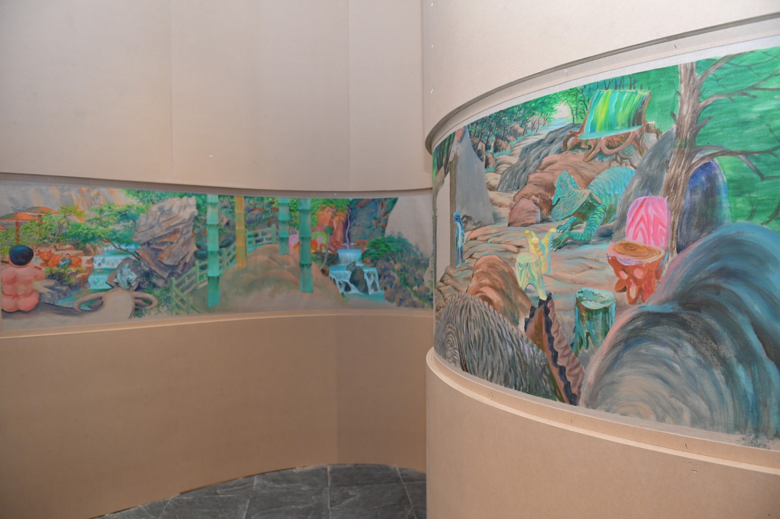 “地洞”一旁是展廳的下沉區(qū)域,這里被策展人設(shè)計為去往“桃花源”的實體路徑。梁碩的《景了個區(qū)》出現(xiàn)在這個下沉空間的一排四個口袋式的連續(xù)隔間墻面上,從空間上來說是無比契合的?;仡櫫捍T2019年在北京公社的展覽《梁碩:景區(qū)》同樣可以見到這樣一種迂回的觀展路徑。“景區(qū)”這個概念的提出,在藝術(shù)家看來代表著今天人們對山水的理解,這個獨特的概念跨越了自然景觀與都市空間。梁碩在自己撰文的《景了個區(qū)》中復(fù)原了一個景區(qū)籌備建立起來的小故事,承包景區(qū)改造的劉工在工期接近尾聲時,看到自己的“杰作”時不由感嘆:“這些水泥造物,居然都妥妥的在那了,像是本來就是從山里長出來的,那巨大的假山石和假樹根顯得造型怪異,卻頗得陳老蓮氣韻,在落日的余暉中與真山融為一體,真山也像了假山……”[6]景區(qū)的建立勢必意味著人工、商業(yè)、消費對自然景觀的直接侵入與改造,空間、審美、意識形態(tài)等一系列問題由此發(fā)生。