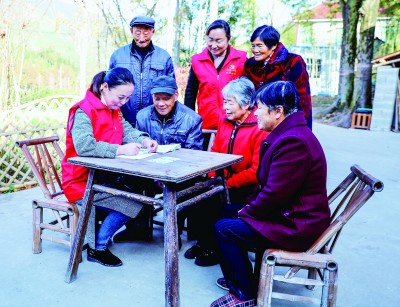 浙江長(zhǎng)興縣和平鎮(zhèn)方家莊村便民服務(wù)中心志愿者為村里老人上門辦理第三代社保卡換證業(yè)務(wù)。新華社發(fā)