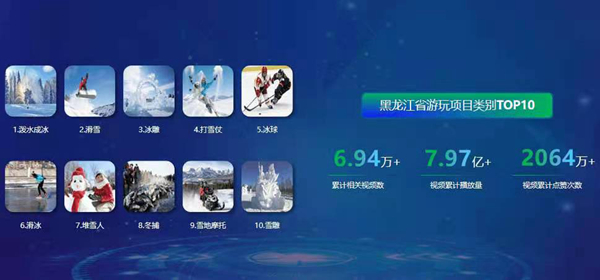 這些游客大部分選擇在冬季來到黑龍江,欣賞冰天雪地。冬季游玩項(xiàng)目是外地游客來黑龍江的源動(dòng)力,2020年,黑龍江省游玩項(xiàng)目類短視頻TOP10中,潑水成冰類視頻深受用戶的喜愛,排在第一位,其次分別是:滑雪、冰雕、打雪仗、冰球、滑冰、堆雪人、冬捕、雪地摩托、雪雕等,所有游玩項(xiàng)目類視頻累計(jì)相關(guān)視頻數(shù)6.94萬+、播放量7.97億+、點(diǎn)贊次數(shù)2064萬+。