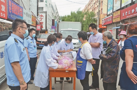 工作人員對市場蔬菜進(jìn)行抽檢。邸巖攝
