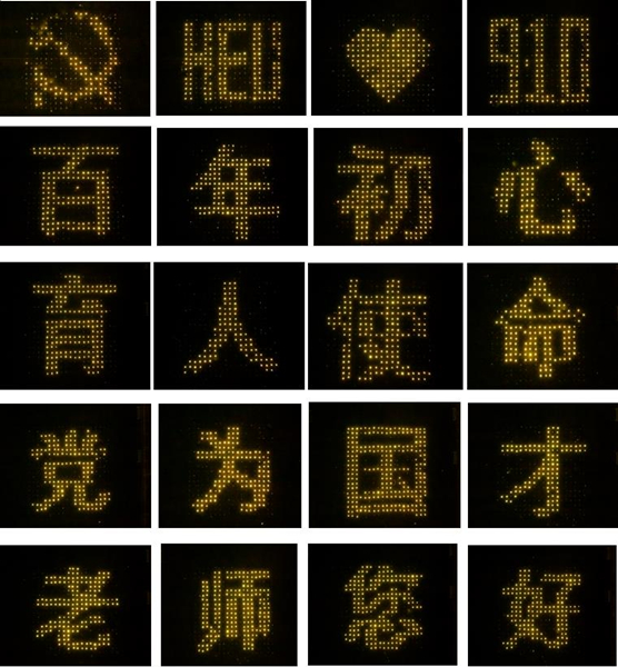 黨徽、HEU(哈工程縮寫)、愛心、9.10、百年初心、育人使命、為黨育人、為國育才、老師您好……同學們匯聚力量共同拼出了24組圖案和字樣,即使天空飄起毛毛細雨,他們也絲毫沒有變換位置,在雨中足足站了兩個小時。2021級博士生王文軒感慨:“作為一名本、碩都就讀于哈工程的學生,這所大學的老師教會了我如何做人做事做學問,我們用這場燈光秀,獻禮我們最尊敬的老師,我們也一定會傳承哈軍工精神,勇?lián)鷱妵倌晔姑鼡??!?/span>
