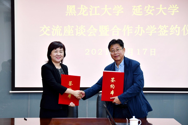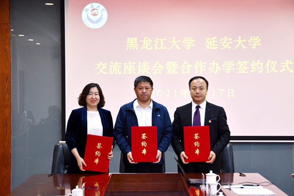 黑龍江大學(xué)于文秀副校長與延安大學(xué)呂達副校長共同簽署學(xué)校層面合作辦學(xué)框架協(xié)議書。黑龍江大學(xué)俄語學(xué)院黨委書記黃東晶、經(jīng)濟與工商管理學(xué)院院長常樹春與延安大學(xué)經(jīng)濟與管理學(xué)院院長王進共同簽署合作備忘錄。黑龍江大學(xué)馬克思主義學(xué)院黨總支書記王培軍與延安大學(xué)馬克思主義學(xué)院黨委常務(wù)副書記張彬簽署合作備忘錄。隨后,雙方圍繞教學(xué)科研平臺進行座談交流。