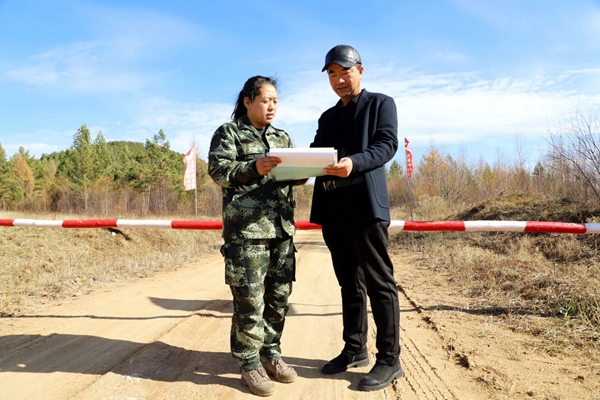 圖為紅旗林場(chǎng)第四管護(hù)站管護(hù)員孟祥茹(左)認(rèn)真做好入山人員信息登記,實(shí)現(xiàn)了人員可追溯、可查詢