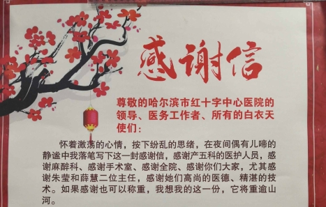 黑龍江經(jīng)濟網(wǎng)訊(孫麗霞 葉鴻 梁新立)“懷著激蕩的心情,按下紛亂的思緒,在夜間偶有兒啼的靜謐中我落筆寫下這一封感謝信……如果感謝也可以稱重,我想我的這一份,它將重逾山河?!苯?,哈爾濱市紅十字中心醫(yī)院(哈爾濱醫(yī)科大學附屬哈爾濱婦產(chǎn)醫(yī)院)產(chǎn)五科收到了來自患者家屬李先生的一封感謝信和一面錦旗。