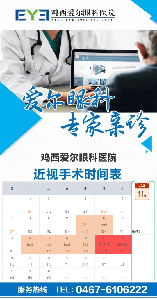 雞西愛爾眼科醫(yī)院近視手術時間表:
