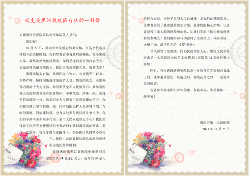 據(jù)介紹,省醫(yī)院支援黑河應(yīng)急醫(yī)療隊(duì)共收治新冠肺炎患者69人,其中重癥1例,最小的患者2歲,最大的患者90歲,在兄弟單位接手前,共治愈出院35人。治療期間,醫(yī)療隊(duì)收到了多封患者表揚(yáng)信,小患者們則用畫筆表達(dá)了對天使們的感謝與敬仰,有的未出院患者聽說省醫(yī)院醫(yī)療隊(duì)要離開了,都依依不舍,紛紛表達(dá)對醫(yī)療隊(duì)精湛的醫(yī)技和暖心醫(yī)療的感謝。