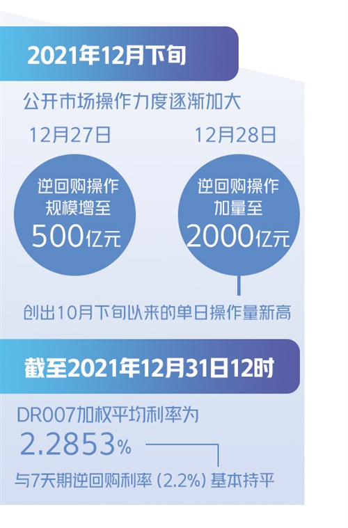 2021年末,中國人民銀行連續(xù)“加碼”公開市場操作。2021年12月31日,人民銀行發(fā)布公告稱,為維護(hù)年末流動性平穩(wěn),當(dāng)日以利率招標(biāo)方式開展了1000億元逆回購操作,期限為7天,利率維持在2.20%。這已是央行連續(xù)4個工作日開展千億級逆回購。