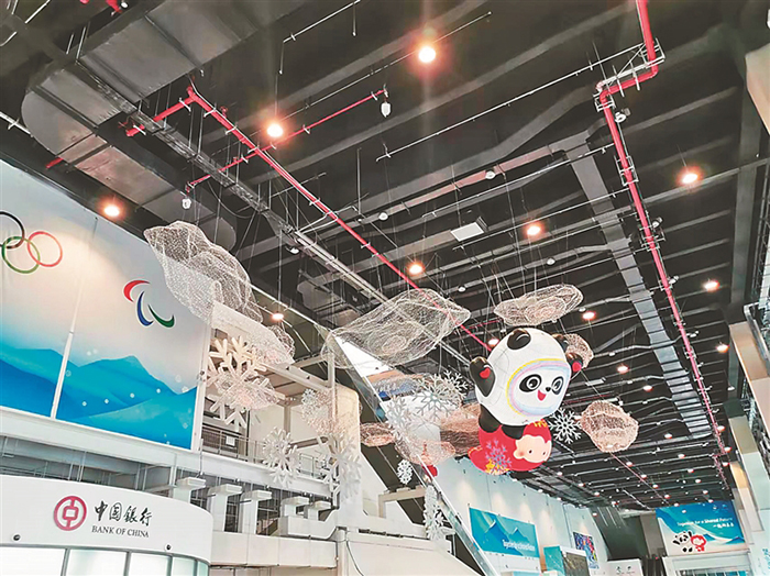 進(jìn)入主媒體中心一層,懸在半空中碩大的冰墩墩和雪容融頗為吸睛,很多媒體記者爭相與其合影。不遠(yuǎn)處,一塊巨大電子高清屏幕,正播放著短道速滑世界杯的比賽視頻,畫面清晰得如同親臨賽場。
