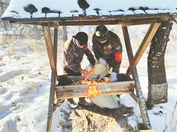 同一時間,青山林場的巡護隊員來到53林班補飼點,貼福字,送“年貨”。“這過年了,狍子野豬的食物也得提檔升級。咱們過年吃餃子,它們也得吃點好的。”隊員王振林邊擺放著玉米、豆餅粉、白菜、蘿卜等食物邊調(diào)侃著。