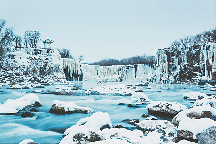 從哈爾濱向東出發(fā),來到世界最大的火山熔巖堰塞湖——鏡泊湖。夏日奔騰咆哮的吊水樓瀑布在冬季可形成厚達(dá)兩米、寬達(dá)數(shù)百米的冰瀑,似冰山聳立,是中國(guó)規(guī)模最大的冰瀑布。當(dāng)夜幕降臨,冰瀑被燈光點(diǎn)亮,銀色的冰柱以及周邊的懸崖峭壁、樹木等由遠(yuǎn)及近全部勾連起來,呈現(xiàn)出光影交織的水墨長(zhǎng)卷。