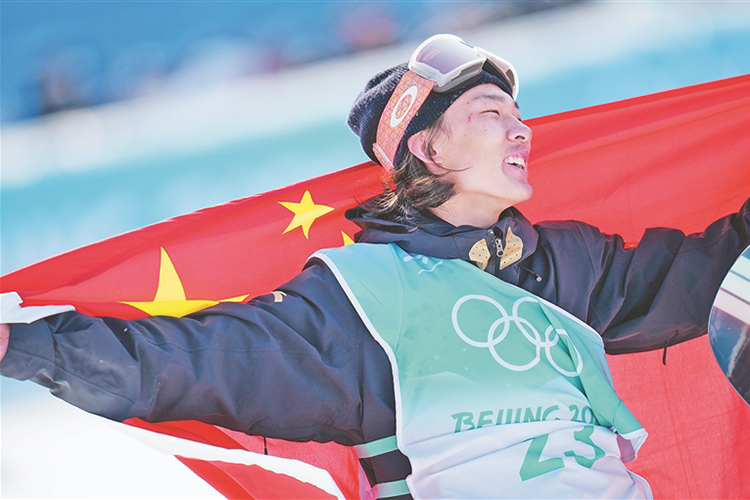 2月15日,中國選手蘇翊鳴在奪冠后慶祝。 當日,北京2022年冬奧會單板滑雪男子大跳臺決賽在北京首鋼滑雪大跳臺舉行。中國選手蘇翊鳴奪得金牌。 新華社記者 李一博攝