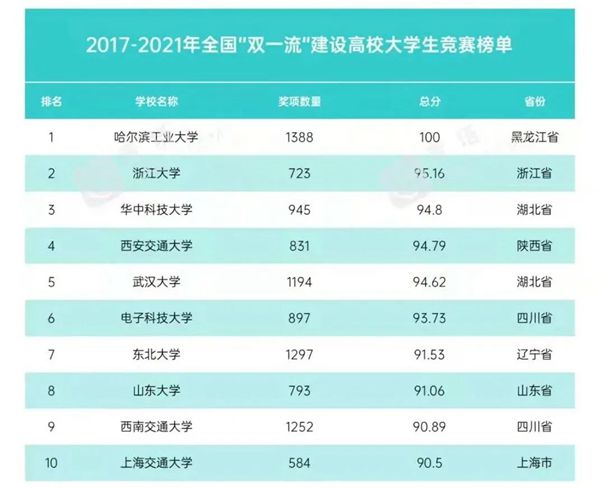 在同時發(fā)布的2017—2021年全國“雙一流”建設(shè)高校大學(xué)生競賽榜單和全國理工類本科院校大學(xué)生競賽榜單中,哈爾濱工業(yè)大學(xué)均列榜首。