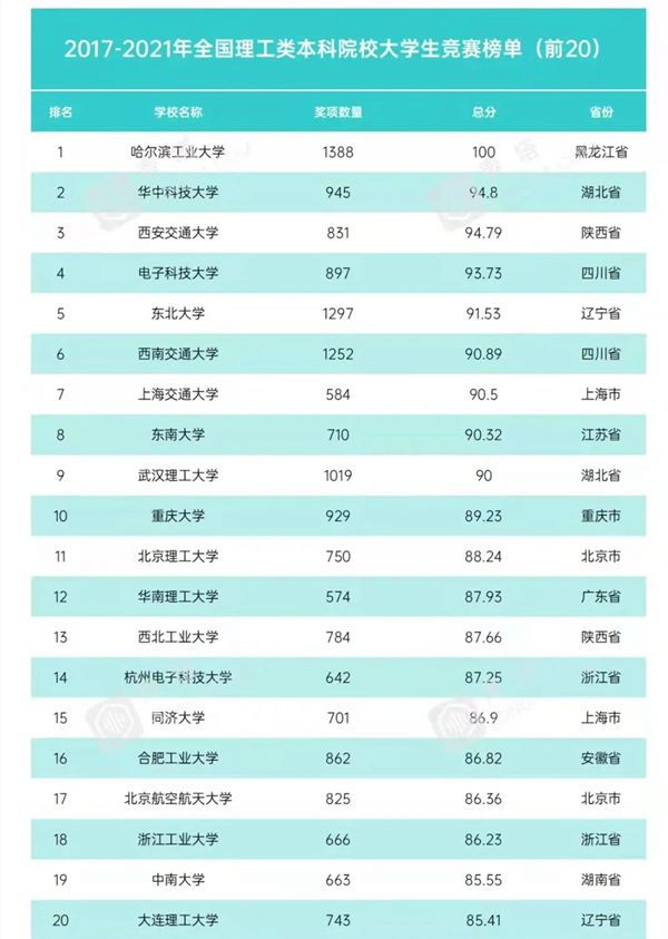 黑龍江經(jīng)濟(jì)網(wǎng)訊(黑龍江日報(bào)全媒體見習(xí)記者董廣碩 商祺)近日,中國高等教育學(xué)會高校競賽評估與管理體系研究工作組發(fā)布2021全國普通高校大學(xué)生競賽分析報(bào)告,全國共有1197所本科院校進(jìn)入2017—2021年本科榜單。哈爾濱工業(yè)大學(xué)以獲獎數(shù)量1388項(xiàng)、總分100分獲得2017—2021年全國普通高校大學(xué)生競賽榜單榜首,以獲獎數(shù)量639項(xiàng)、總分100分獲得2021年全國普通高校大學(xué)生競賽榜單榜首。這是哈爾濱工業(yè)大學(xué)連續(xù)3次獲得上述榜單冠軍。