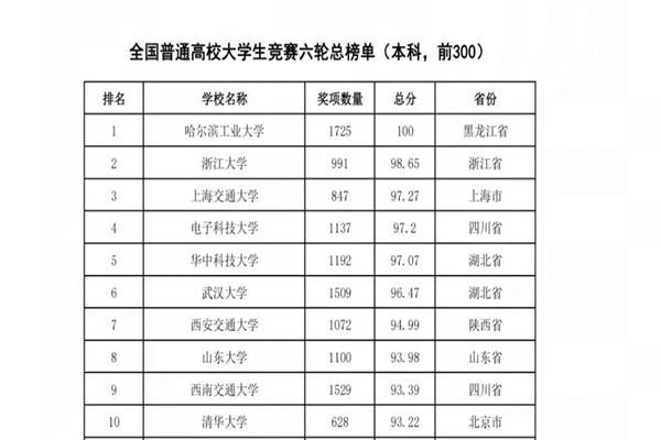哈爾濱工業(yè)大學(xué)以獲獎數(shù)量1725項(xiàng)、總分100分的絕對優(yōu)勢獲得全國普通高校大學(xué)生競賽六輪總榜單冠軍。