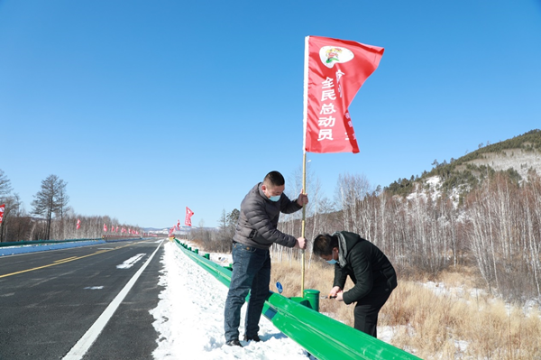 長(zhǎng)山林場(chǎng)干部職工在G111國道安裝防火彩旗。(王力 攝)