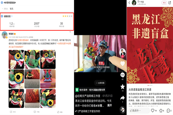 “黑龍江冰雪非遺盲盒”是省文旅廳在第二屆冰雪非遺節(jié)期間,依托黑龍江省豐富的非物質(zhì)文化遺產(chǎn)資源,推出的創(chuàng)意營(yíng)銷活動(dòng)?;顒?dòng)期間,甄選了陳氏布藝、樺樹皮畫、剪紙、鰉魚等黑龍江非遺產(chǎn)品,涵蓋了藝術(shù)品、美食等多種品類,通過官方微博及微信公眾平臺(tái)策劃線上招募“非遺體驗(yàn)官”、非遺問答游戲等多種形式活動(dòng),隨機(jī)發(fā)放盲盒,充分展示了龍江非遺的獨(dú)特魅力。