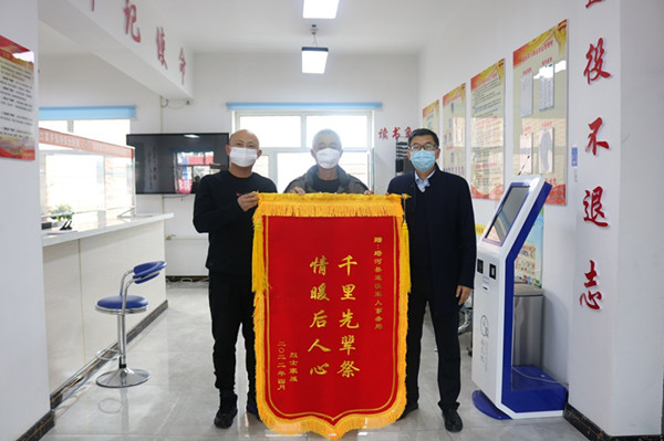 離開塔河前,老人拿著錦旗來到縣退役軍人服務中心。他表示,此行受到工作人員如家人般的接待十分暖心,對陵園的管理非常認可和感謝。時隔55年,跨越3300多公里,安邦勤老人終圓夢。