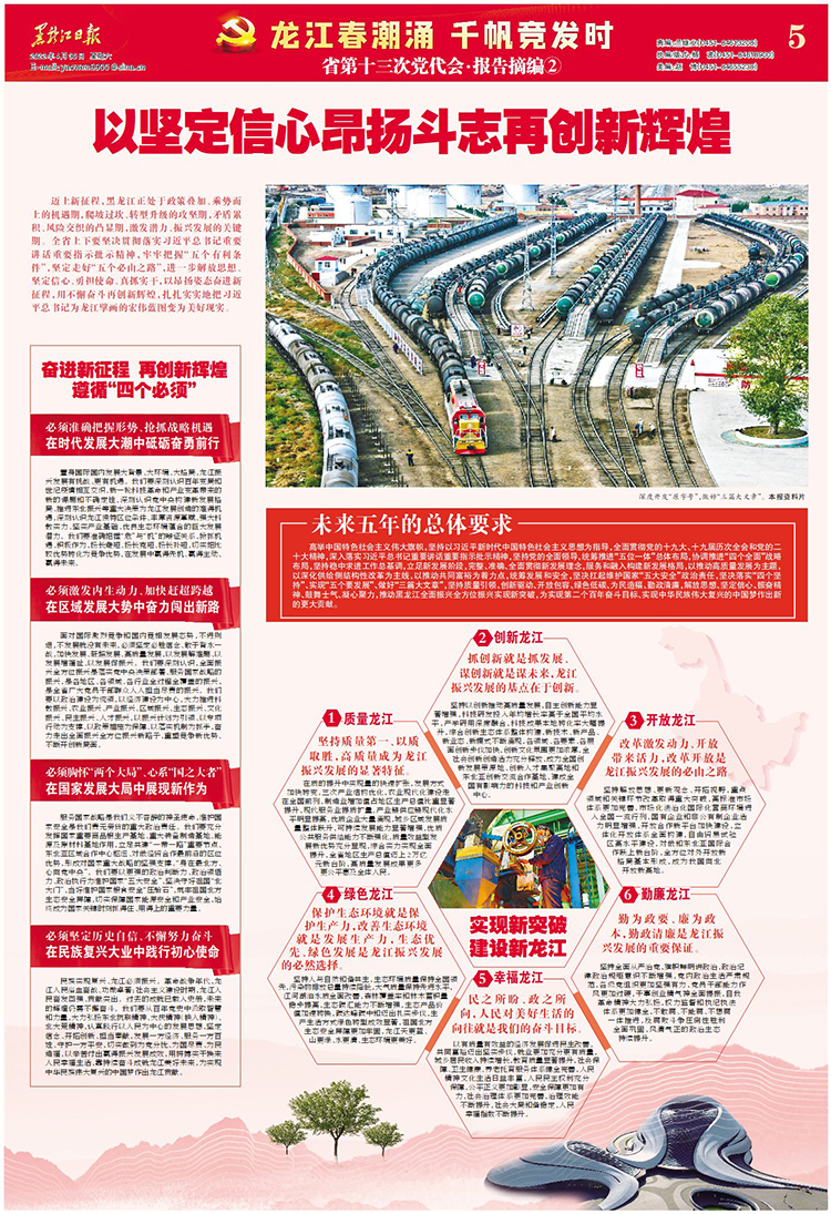 邁上新征程,黑龍江正處于政策疊加、乘勢而上的機(jī)遇期,爬坡過坎、轉(zhuǎn)型升級的攻堅期,矛盾累積、風(fēng)險交織的凸顯期,激發(fā)潛力、振興發(fā)展的關(guān)鍵期。全省上下要堅決貫徹落實習(xí)近平總書記重要講話重要指示批示精神,牢牢把握“五個有利條件”,堅定走好“五個必由之路”,進(jìn)一步解放思想、堅定信心、勇?lián)姑?、真抓實干,以昂揚姿態(tài)奮進(jìn)新征程,用不懈奮斗再創(chuàng)新輝煌,扎扎實實地把習(xí)近平總書記為龍江擘畫的宏偉藍(lán)圖變?yōu)槊篮矛F(xiàn)實。