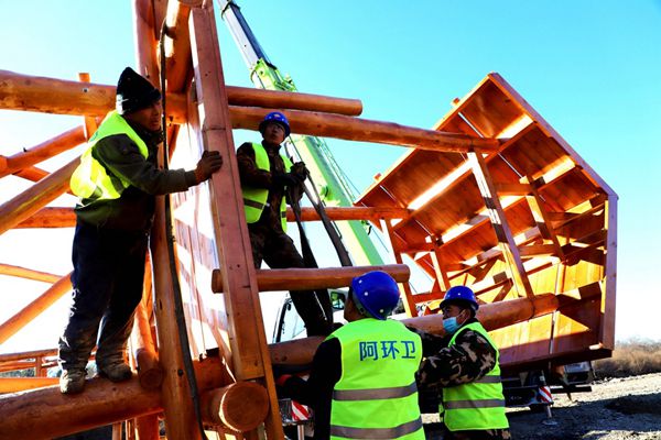 阿木爾林業(yè)局建設(shè)者安裝薩布素景點(diǎn)大門(王力 攝)
