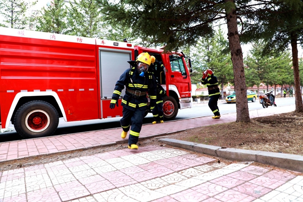 阿木爾林業(yè)局城鎮(zhèn)消防大隊(duì)?wèi)?zhàn)斗員迅速到達(dá)模擬火警點(diǎn),開展救助行動(王力 攝)