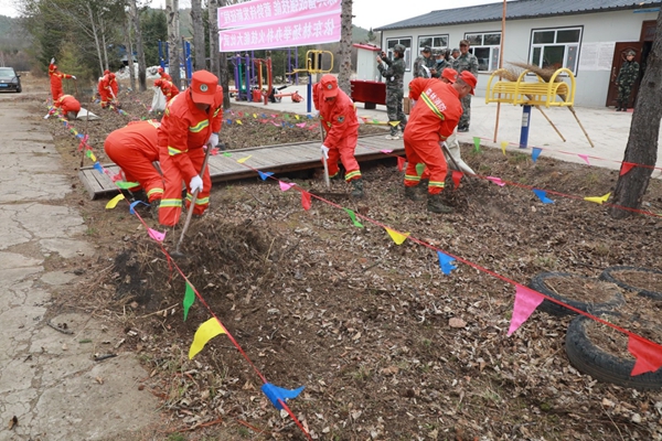 開設(shè)防火隔離帶,是阻擋火源的有效方法。依東林場將環(huán)境衛(wèi)生整治與防火科目結(jié)合起來,在門前擺下擂臺,拉出橫線設(shè)立分區(qū),六組隊(duì)員進(jìn)入場地爭分奪秒、互不相讓,有的耙、有的裝,一會功夫一條干凈、規(guī)范的“隔離帶”出現(xiàn)在眼前。