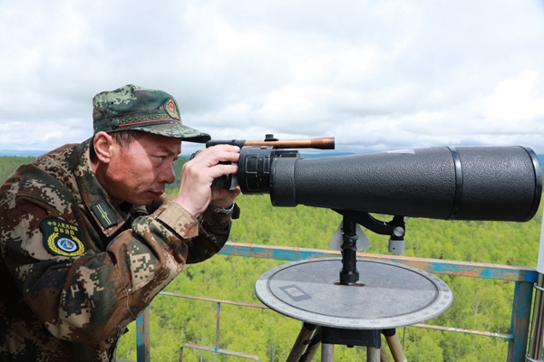 阿木爾林業(yè)局紅旗林場(chǎng)“阿08”瞭望塔瞭望員鄭巖瞭望遠(yuǎn)處群山(王力 攝)