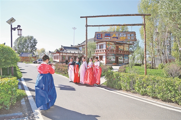 在佳木斯市樺川縣星火村,黃墻青瓦村舍整齊劃一,身著朝鮮族民族服飾的村民們?cè)趶V場(chǎng)上載歌載舞。
