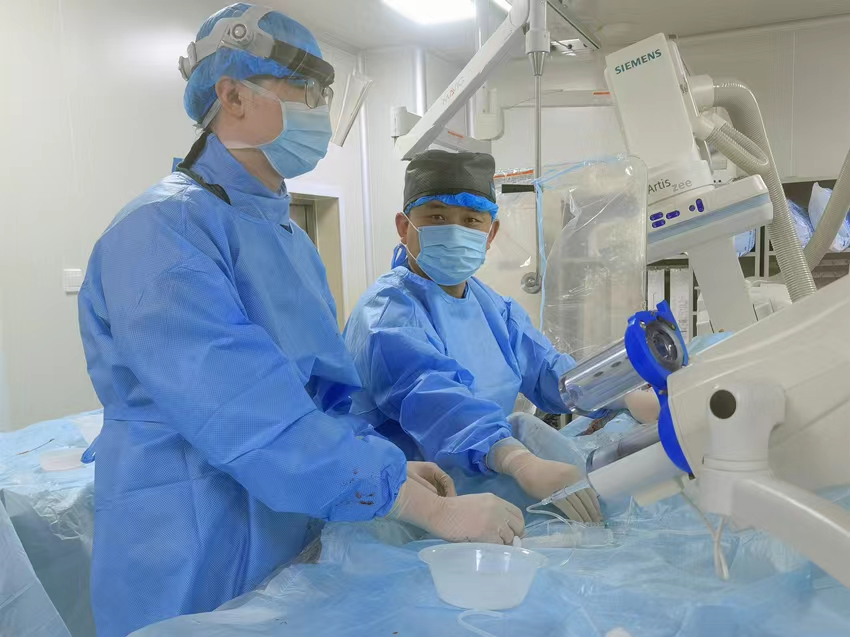 “患者入院后雖進(jìn)行了快速靜脈溶栓,但病情依然進(jìn)展性加重,我們發(fā)現(xiàn)患者病情為顱內(nèi)主干血管閉塞導(dǎo)致,情況十分危急,如果不及時(shí)介入開通閉塞的顱內(nèi)大血管,一旦錯(cuò)過治療最佳時(shí)機(jī),患者就可能會(huì)出現(xiàn)危及性命等情況?!泵F副主任醫(yī)師回憶了當(dāng)時(shí)搶救情景。搶救刻不容緩,在爭得家屬同意并簽字后,神經(jīng)介入團(tuán)隊(duì)立即將張先生送至導(dǎo)管室進(jìn)行介入取栓治療。
