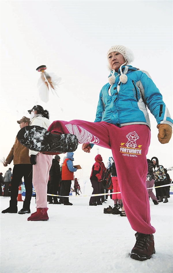 冰天雪地踢毽子。