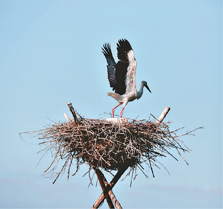 保護區(qū)管理局保護科負責(zé)人欒新介紹,30年的時間里,人工招引巢結(jié)構(gòu)由原來的單一人工樹巢更新優(yōu)化到鐵質(zhì)三腳架招引巢,具有牢固性強、耐腐爛、利用年限久、招引成功率更高的特點。截至目前,保護區(qū)已為東方白鸛搭建了人工招引巢389個。