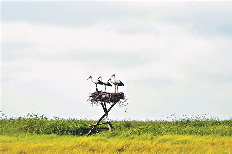 走進保護區(qū)內(nèi),翠綠豐茂的水草之下河水潺潺流動,不時有東方白鸛從高空飛到河邊覓食。這里雖然少有人類活動的痕跡,但為東方白鸛高高筑起的人工招引巢隨處可見。