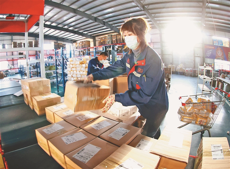 俄品多倉儲配送中心工作人員包裝配送線上商品。