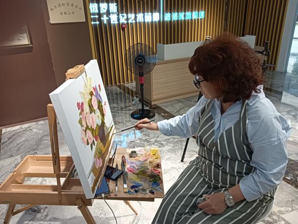 活動期間,柯切爾金娜·伊麗娜到哈爾濱綜合保稅區(qū)參觀俄羅斯文化展示館(俄中藝術(shù)線下商城體驗店No.1),與哈爾濱綜合保稅區(qū)領(lǐng)導就中俄優(yōu)秀傳統(tǒng)文化進行了友好交流,并即興在展館內(nèi)現(xiàn)場作畫。伊麗娜以繪畫花卉靜物著名,曾榮獲俄羅斯文化部獎狀、俄羅斯文化部榮譽證書、俄羅斯美協(xié)銀質(zhì)獎?wù)隆?