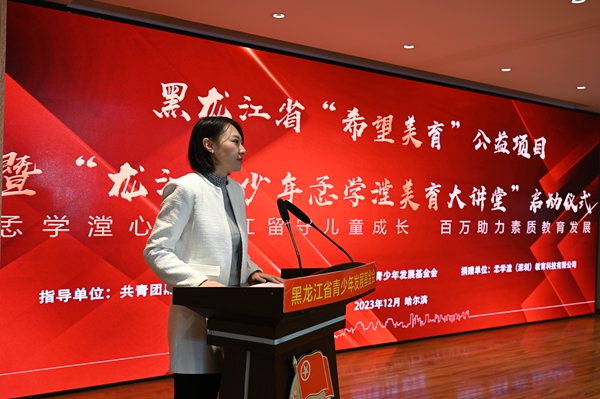 為深入貫徹習(xí)近平總書記對希望工程實(shí)施30周年的重要寄語精神,進(jìn)一步提升新時(shí)代希望工程的助學(xué)育人質(zhì)量,12月12日,黑龍江省“希望美育”公益項(xiàng)目暨“龍江青少年孞學(xué)漟美育大講堂”啟動(dòng)儀式在希望大廈舉行。黑龍江省文學(xué)藝術(shù)界聯(lián)合會(huì)一級(jí)巡視員張正明,共青團(tuán)黑龍江省委副書記代東力,黑龍江省青聯(lián)委員、深圳市孞學(xué)漟教育科技有限公司創(chuàng)始人楊梓杺,黑龍江省民政廳、黑龍江省青少年發(fā)展基金會(huì)等相關(guān)單位領(lǐng)導(dǎo),嘉仁公益、益家公益代表,伙伴計(jì)劃社區(qū)代表,哈爾濱市松北區(qū)樂業(yè)小學(xué)“童心港灣”代表,哈爾濱市蘇寧紅軍小學(xué)校、哈爾濱市合眾人壽希望小學(xué)、哈爾濱新區(qū)第三學(xué)校等學(xué)校師生代表參加活動(dòng)。