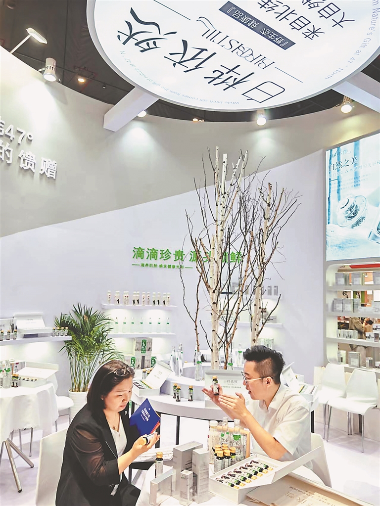 “產品所用的白樺汁原料源自鐵力市,這里處在北緯47°小興安嶺的黑土地上?!焙邶埥陼钥萍加邢薰究偨浝眈R光西介紹,公司充分利用龍江“九珍十八品”資源,由雨曉集團與清華大學深圳科研團隊合作,運用先進技術開發(fā)提煉出白樺汁精華,為消費者不斷提供囗感獨特的綠色飲品、化妝品?,F(xiàn)在企業(yè)庫存清空,鐵力工廠正加班加點生產。本次展會的火爆出圈,讓企業(yè)對白樺汁系列產品走向世界市場更加充滿信心。