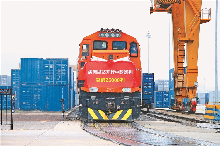 滿洲里是我國(guó)最大的陸路邊境口岸城市,經(jīng)由滿洲里鐵路口岸通行的中歐班列約占全國(guó)口岸通行總量的三成。隨著共建“一帶一路”倡議的深入推進(jìn),中歐班列跑出高質(zhì)量發(fā)展的新速度,數(shù)據(jù)顯示,自2013年中歐班列首次經(jīng)由滿洲里鐵路口岸開行以來,該口岸中歐班列通行量達(dá)到10000列用時(shí)超過7年,而從10000列到25000列僅用了三年時(shí)間,2023年滿洲里鐵路口岸年通行量首次突破5000列,班列通行量、貨物運(yùn)送量連續(xù)10年實(shí)現(xiàn)增長(zhǎng)。