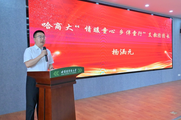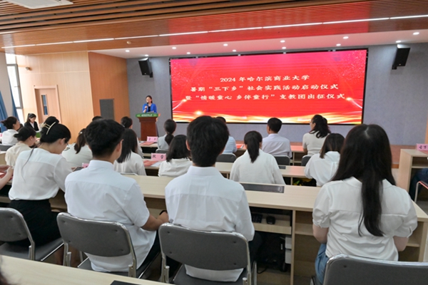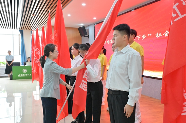 省希望工程捐助中心主任、省青少年發(fā)展基金會理事長杜晶為哈爾濱商業(yè)大學(xué)2024年“三下鄉(xiāng)”社會實(shí)踐團(tuán)隊(duì)代表、“情暖童心·鄉(xiāng)伴童行”支教團(tuán)代表授旗,希望即將奔赴龍江大地的志愿者們能夠充分利用服務(wù)期,向下扎根、向上生長,踐行志愿服務(wù)精神,在奉獻(xiàn)與收獲中積累報國為民的樸素情懷,做有理想、有擔(dān)當(dāng)?shù)男聲r代青年。