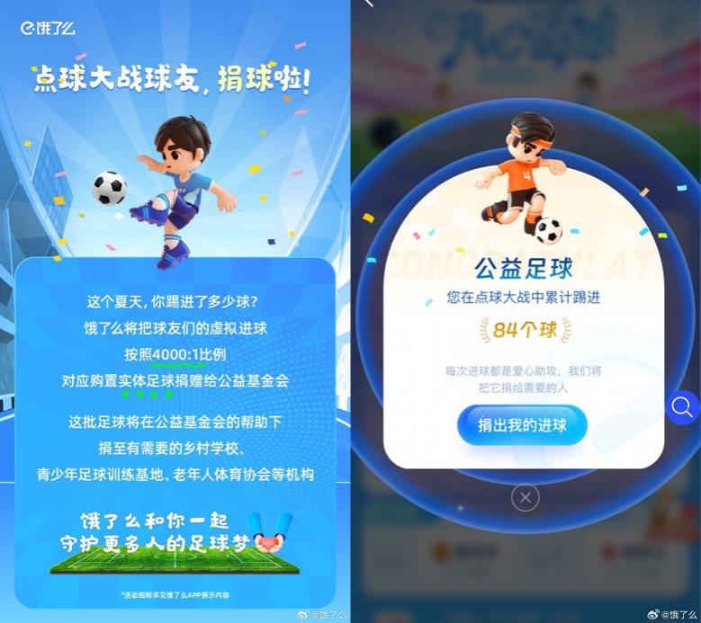 7月15日歐洲杯正式落幕,餓了么也官宣同步上線足球捐贈(zèng)活動(dòng)。據(jù)介紹,用戶可以選擇捐贈(zèng)這一個(gè)月來在“點(diǎn)球大戰(zhàn)”游戲中累積的虛擬進(jìn)球,餓了么將聯(lián)合公益基金會(huì),按照捐贈(zèng)總數(shù)量的1/4000,對(duì)應(yīng)捐贈(zèng)實(shí)物足球給到有需要的鄉(xiāng)村學(xué)校、青少年足球訓(xùn)練基地、老年人體育協(xié)會(huì)等。同時(shí),餓了么還開放征集入口,有需要的個(gè)人和機(jī)構(gòu)可以填寫地址申請(qǐng)?jiān)撆鷲坌淖闱?。截至目前,捐?zèng)點(diǎn)球數(shù)量已有數(shù)千萬。