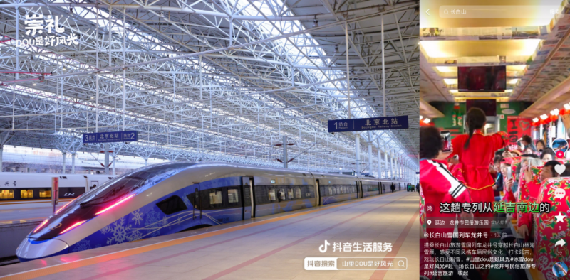 在線下,活動還聯(lián)動崇禮區(qū)政府、延邊州商務(wù)局、齊齊哈爾網(wǎng)信辦落地雪國專列,覆蓋復(fù)興號、民俗專列、高鐵站等不同場景,讓游客和市民感受濃濃冰雪氛圍,自發(fā)為當(dāng)?shù)匚穆梅N草,吸引更多雪友來到小城看見好風(fēng)光。截至活動收官,“開往崇禮站的雪國專列”熱度達(dá)827萬,一度登上抖音河北多地同城榜TOP1。