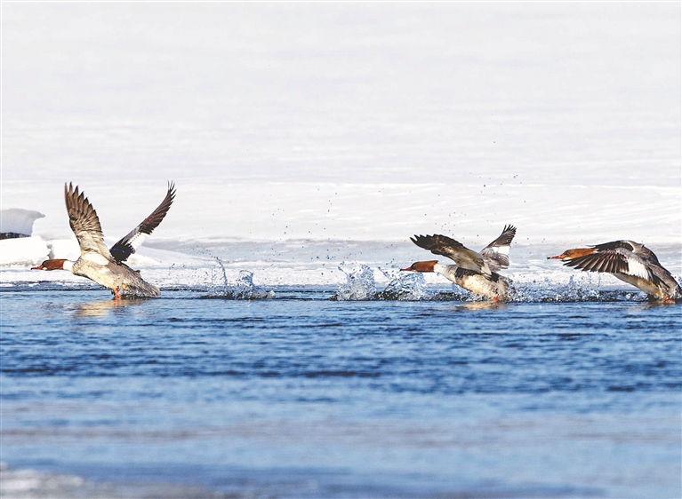 本報(bào)訊(黃曉光 記者郭俊峰)近日,國家一級(jí)保護(hù)動(dòng)物秋沙鴨翩然而至,為小興安嶺的初春增添了別樣生機(jī)。它們?cè)诔纬旱乃嫔嫌迫挥芜?,時(shí)而將頭扎進(jìn)水里,探尋著水下的美味;時(shí)而歡快地拍打著翅膀,濺起晶瑩的水花。