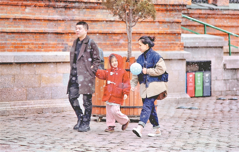 哈爾濱市的雪花落地后融化成水,未對道路交通造成影響。人們紛紛拿出手機(jī)拍攝精彩瞬間。
