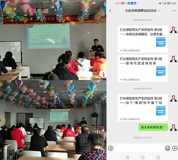 在此次打擊“代理退?!毙麄骰顒又?,七臺河中支利用微信工作群、微信朋友圈轉(zhuǎn)發(fā)宣傳內(nèi)容,詳細剖析了黑灰產(chǎn)的常見運作模式,非法“代理退保”可能給消費者帶來的四方面風險:一是資金受損風險;二是喪失正常保險保障的風險;三是個人信息泄漏風險;四是相關(guān)行為可能導(dǎo)致消費者面臨訴訟等法律風險。號召廣大群眾增強風險防范意識,警惕非法“代理退?!碧茁?。
