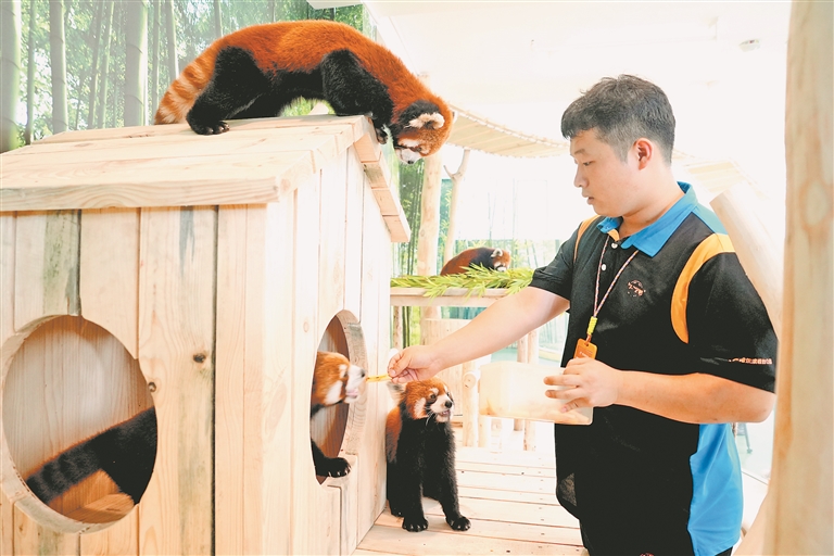 小熊貓是國(guó)家二級(jí)保護(hù)動(dòng)物,野外種群數(shù)量不足萬(wàn)只。保育員團(tuán)隊(duì)精心準(zhǔn)備小熊貓的飲食,專(zhuān)門(mén)從四川空運(yùn)新鮮竹子并搭配多種營(yíng)養(yǎng)餐食,確保小熊貓們健康成長(zhǎng)。本報(bào)記者 董廣碩攝