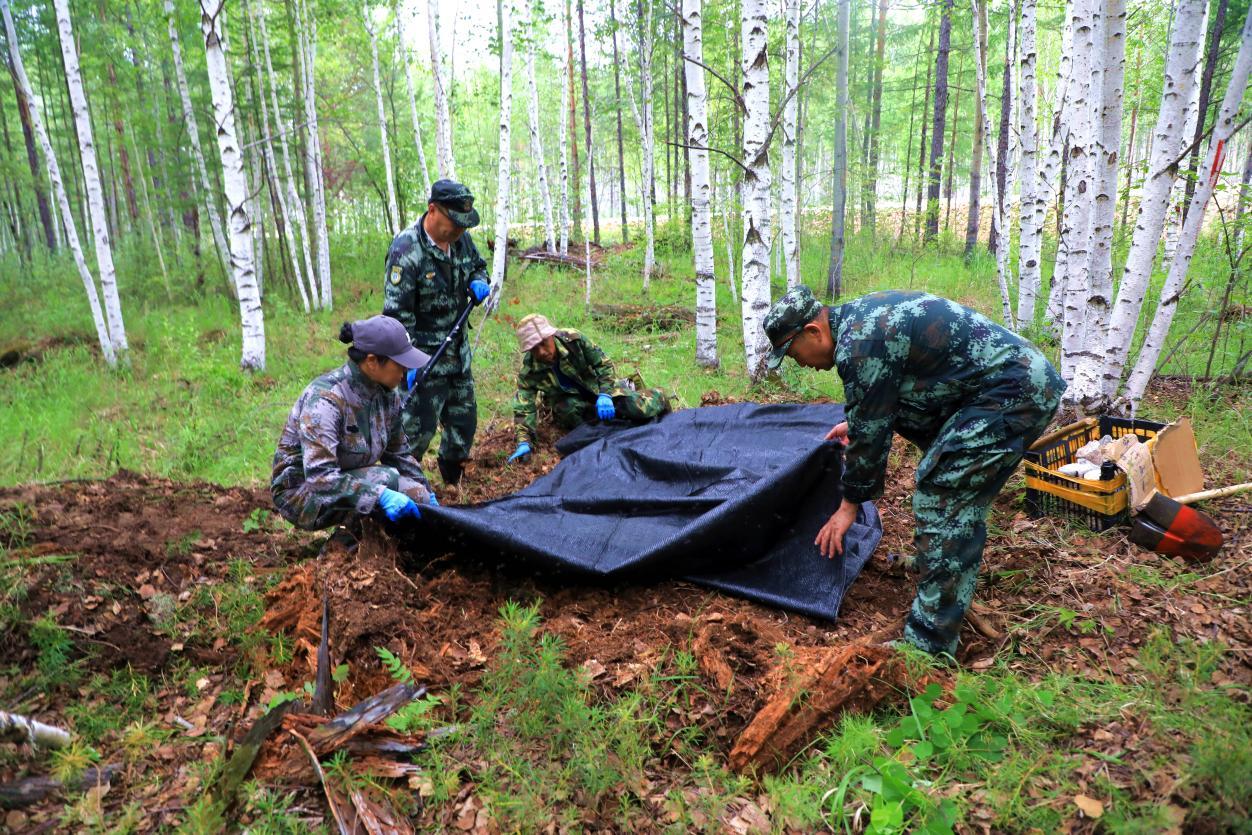 阿木爾林業(yè)局工作人員在利用剩余物培育林下赤松茸(王力 攝)