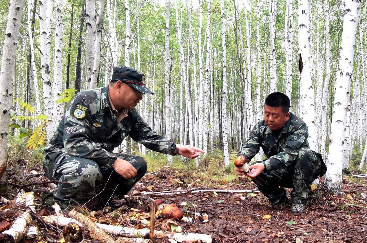阿木爾林業(yè)局工作人員在查看林下培育赤松茸長(zhǎng)勢(shì)情況(王力 攝)