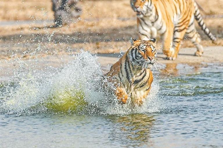 為提高游客觀賞體驗,園區(qū)通過工作車、無人機等多種方式,引導(dǎo)東北虎進行水中捕食等,激發(fā)東北虎的野性與活力的同時,為游客呈現(xiàn)一場真實、震撼的視覺盛宴。