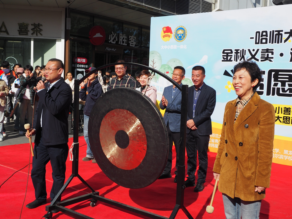 受贈(zèng)方香坊區(qū)幸福鎮(zhèn)哈藥希望小學(xué)校長(zhǎng)劉壯現(xiàn)場(chǎng)介紹了這所希望小學(xué)留守兒童的情況。開(kāi)幕式最后,黃磊理事長(zhǎng)和張靜萍書(shū)記一同敲響大鑼?zhuān)Q鑼開(kāi)市。