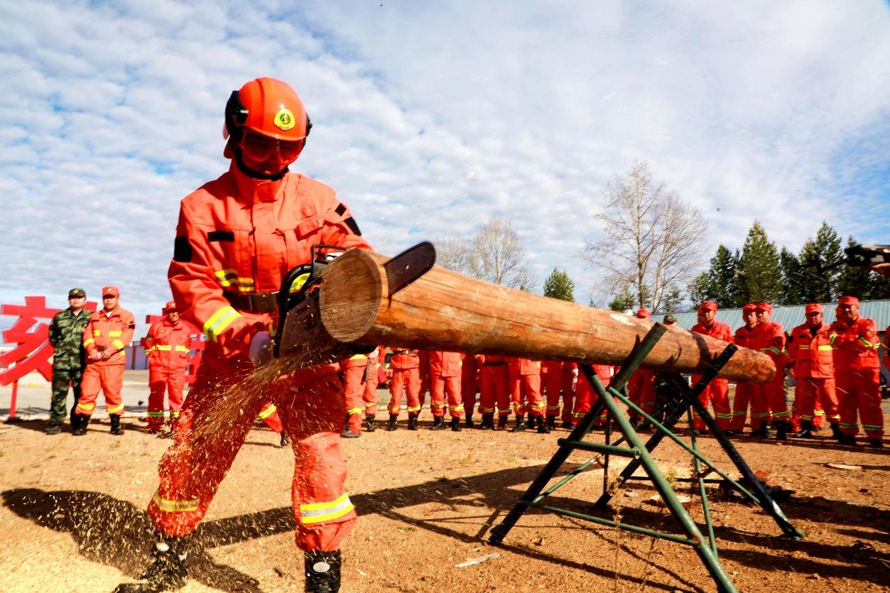 阿木爾林業(yè)局撲火專(zhuān)業(yè)隊(duì)員在進(jìn)行油鋸割木競(jìng)賽(王力 攝)