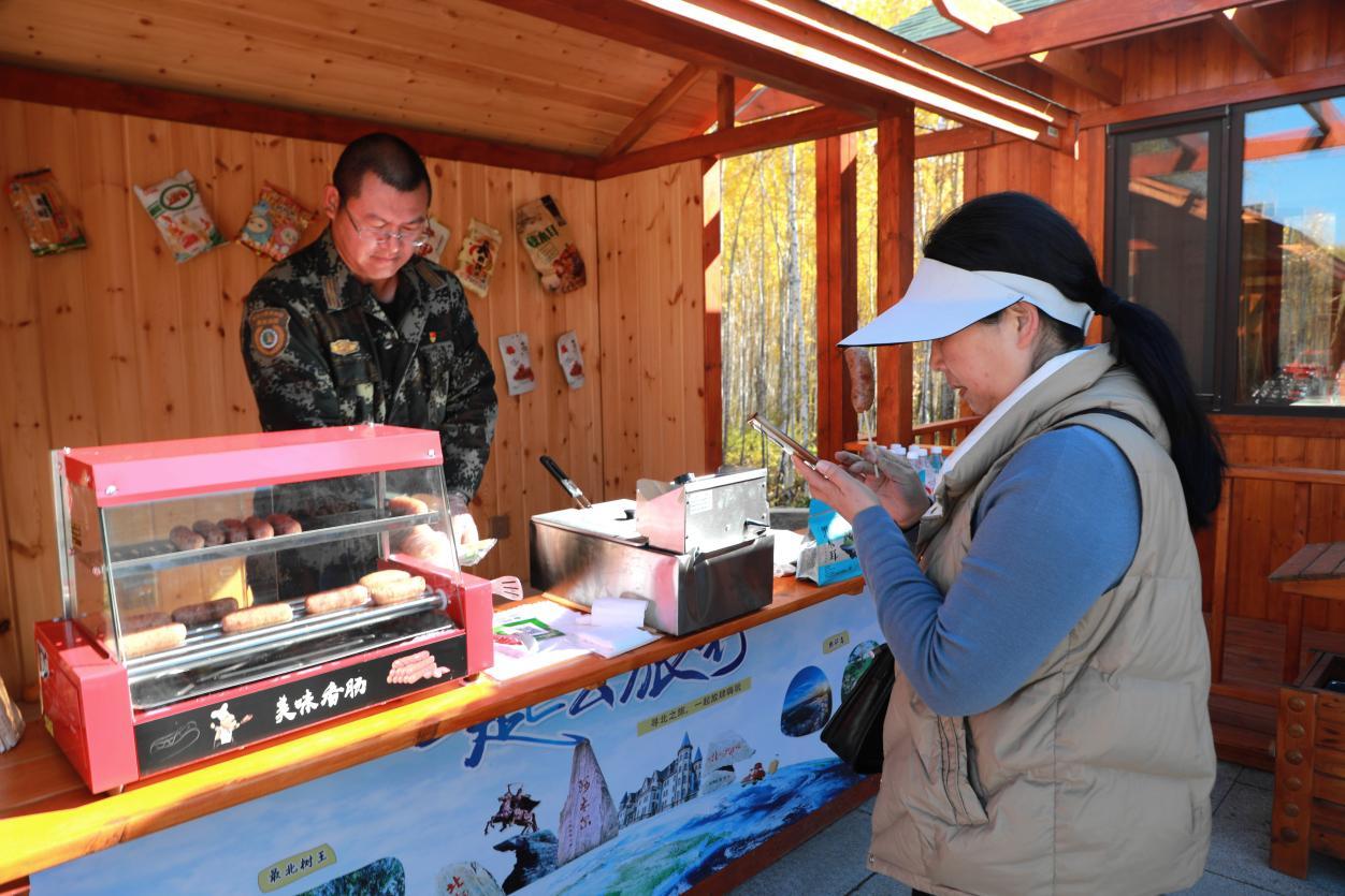 商鋪內(nèi)商品品類豐富多元,從北極冰酒、雪酒等特色酒品,到黑木耳、野生蘑菇、樺樹汁等原生態(tài)林下珍品,再到烤肉等風(fēng)味美食及樺樹皮畫等文創(chuàng)產(chǎn)品,琳瑯滿目的商品精準(zhǔn)契合游客消費需求,吸引前往龍江第一灣的游客駐足打卡、體驗消費。同時,林業(yè)局從游客需求出發(fā),在商業(yè)區(qū)人性化設(shè)置休息長凳,并依托與伯勒梅里餐廳相鄰的區(qū)位優(yōu)勢,構(gòu)建起“購物+餐飲+歇息+游玩”的一站式服務(wù)體系,進(jìn)一步提升了游客體驗感。